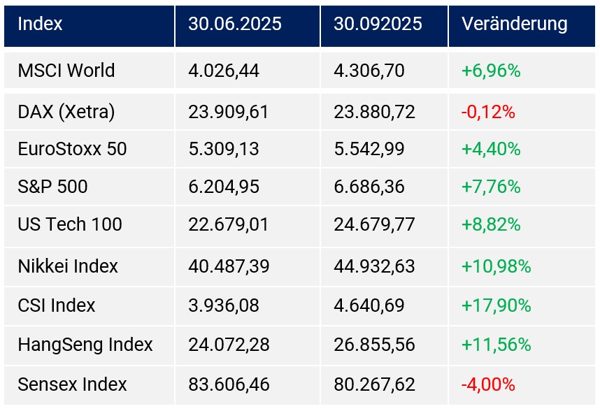 Die stabile bis leicht freundliche globale Konjunkturlage war neben den Zinssenkungen der Federal Reserve und der Bank of England wesentlich verantwortlich für die überwiegend freundliche Performance der Aktienmärkte, insbesondere in den USA und in Fernost ex Indien. Die geowirtschaftlichen und geopolitischen Herausforderungen und/oder Eskalationen stellten im 3. Quartal 2025 nur kurzfristige Belastungen für die Aktienmärkte dar.